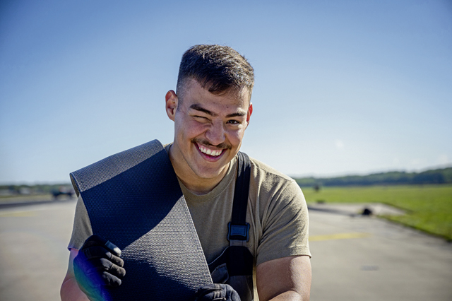 Airman First Class Juan Mejia, 86th Civil Engineer Squadron electrical power production apprentice, carries nylon tape for the Barrier Arresting Kit-12 during the system overhaul at Ramstein Air Base, Germany, Sept. 22, 2022. The system acts as a mechanical barrier capable of rapidly decelerating any landing aircraft with a tail hook. (U.S. Air Force photo by Staff Sgt. Jacob Wongwai)