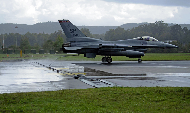An F-16 Fighting Falcon aircraft, assigned to Spangdahlem Air Base, Germany, runs through a test of the Barrier Arresting Kit-12 at Ramstein Air Base, Germany, Sept. 29, 2022. The BAK-12 decelerates the aircraft on the runway, ensuring the pilot and aircraft lands safely if they are unable to. (U.S. Air Force photo by Airman 1st Class Jordan Lazaro )