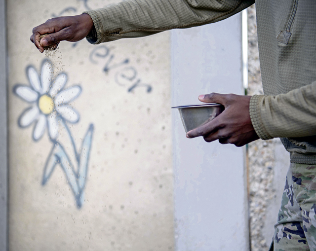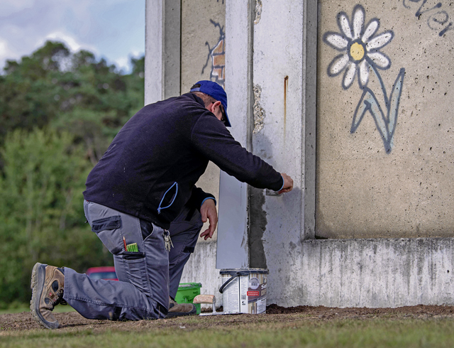 Airmen dug a rectangle 17 feet long, 6 feet wide and 20 inches deep at the new location with the subgrade and a base course to place the Berlin Wall upon. Afterward, they poured 12 inches of concrete around the base of the wall to hold it in place.