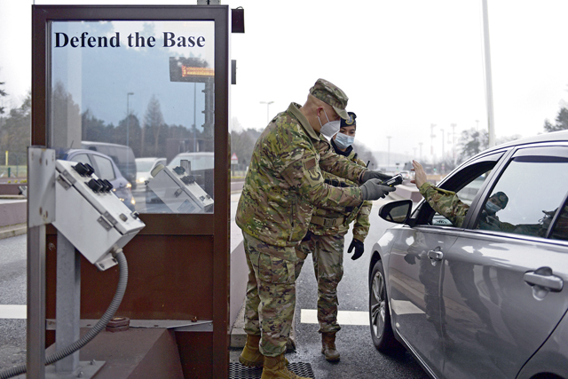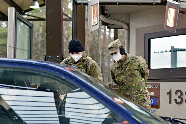 U.S. Air Force Brig. Gen. Josh Olson, 86th Airlift Wing commander, uses a scanner while working with the 86th Security Forces Squadron to check personnel in at the gates on Ramstein Air Base, Feb. 8. Defenders working at the gates scan and visually inspect the ID cards of all vehicle occupants.