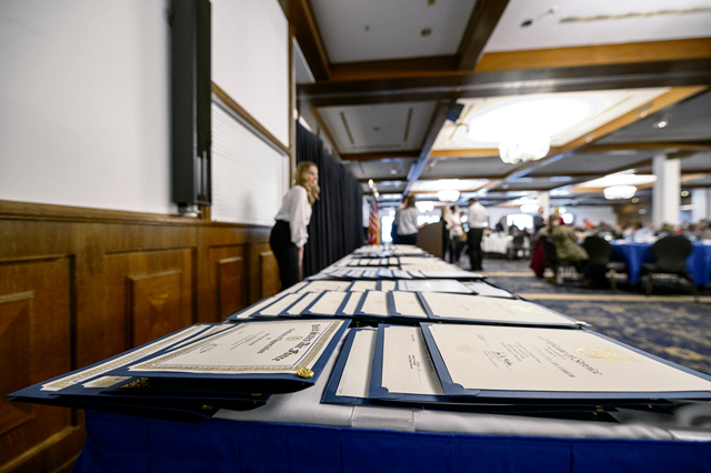 Awards for the Length of Service Ceremony are placed before the event begins at Ramstein Air Base, Germany, Dec. 5, 2024. Ramstein Air Base conducts a Length of Service Ceremony twice a year to recognize employees with over 20 years of U.S. military service. (U.S. Air Force photo by Senior Airman Renan Arredondo)