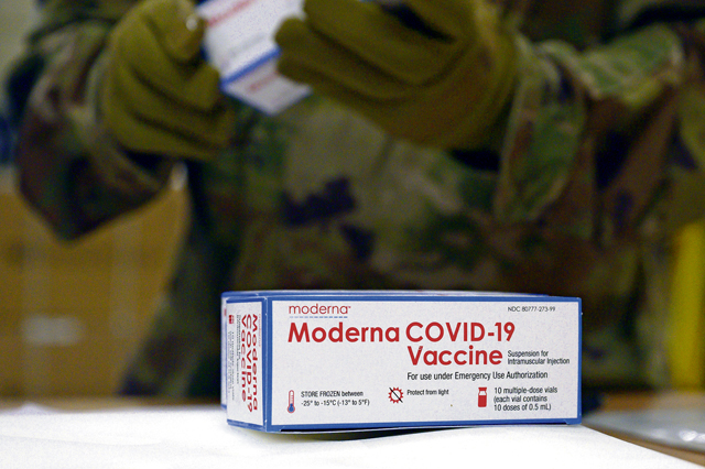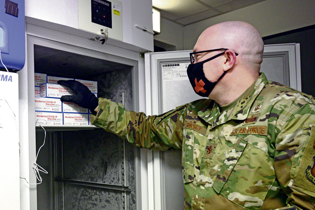 U.S. Air Force Maj. Christopher Robosky, 86th Medical Group medical logistics flight commander, places COVID-19 vaccines in a freezer at Ramstein Air Base, Jan. 18. The Moderna COVID-19 Vaccine is distributed as a shot in the upper arm in two doses dated at least one month apart.