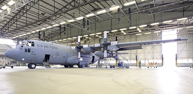 A C-130H Hercules ground trainer aircraft rests in a hangar at Ramstein Air Base, June 15. The 86th Maintenance Squadron removed fuel tanks from each wing of the aircraft to use for confined space training.
