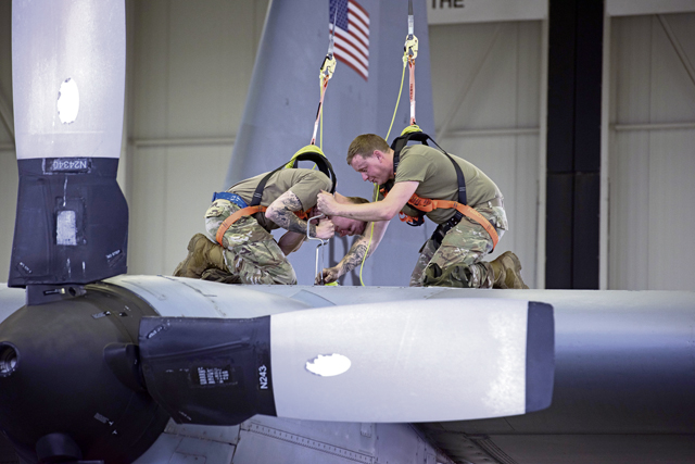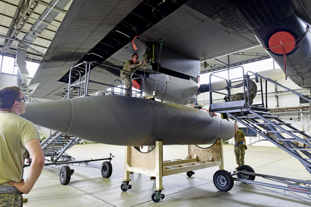 U.S. Airmen assigned to the 86th Maintenance Squadron lower a C-130H Hercules ground trainer aircraft fuel tank into a stand at Ramstein Air Base, June 15. The aircraft fuel systems repair section designed and built stands to house the fuel tank.
