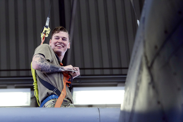 U.S. Air Force Senior Airman Colby Moore, 86th Maintenance Squadron aircraft fuel systems journeyman, lowers a C-130H Hercules ground trainer aircraft fuel tank at Ramstein Air Base, June 15. The additional hands-on training from the extracted fuel tanks is estimated to save the Air Force up to $700,000.