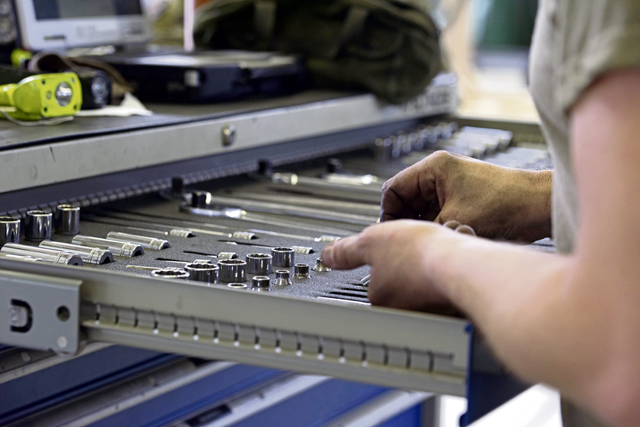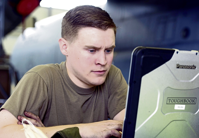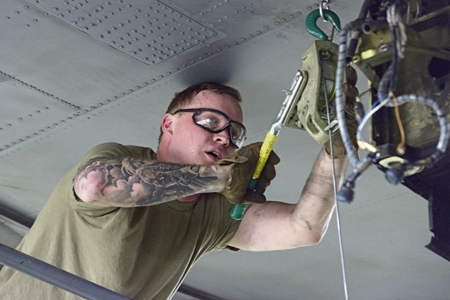 U.S. Air Force Senior Airman Colby Moore, 86th Maintenance Squadron aircraft fuel systems journeyman, searches through a toolbox at Ramstein Air Base, June 15. Moore and his colleagues extracted fuel tanks from a C-130H Hercules ground trainer aircraft to utilize later as confined space trainers for on-the-job instruction.