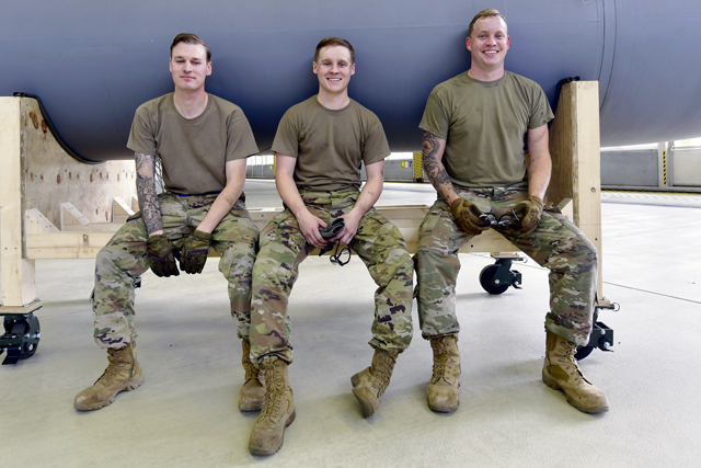 Left to right: U.S. Air Force Staff Sgt. Jubal Johnson, 86th Maintenance Squadron aircraft fuel systems craftsman, left, Tech. Sgt. Jakeb Hurley, 86th Airlift Wing non-commissioned officer in charge of wing plans and programs, center, and Senior Airman Colby Moore, 86th MXS aircraft fuel systems journeyman, pose for a photo after extracting a fuel tank from a C-130H Hercules ground trainer aircraft at Ramstein Air Base, June 15. The fuel tanks from the aircraft will increase the overall effectiveness of the 86th MXS by giving additional opportunities for training in confined spaces.