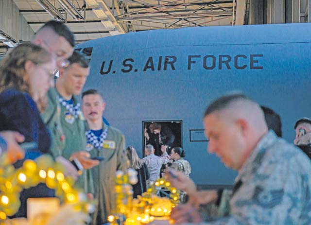 A static display of a C-130J Super Hercules aircraft is the backdrop for the Air Force Gala at Ramstein Air Base, Oct. 14. More than 300 people attended the RAB gala.