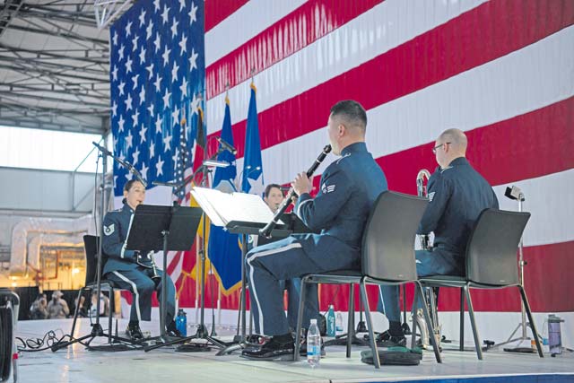 The United States Air Forces in Europe Band plays music for the attendees of the Air Force Gala at Ramstein Air Base, Oct. 14. The Gala is a longstanding tradition commemorating the anniversary of the Air Force.