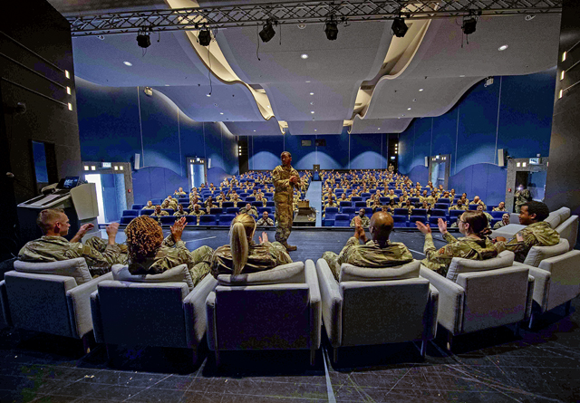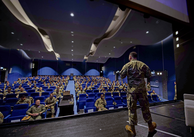 More than 500 members from the Kaiserslautern Military Community and geographically separated units gather at the Ramstein Enlisted Summit at the Hercules Theater on Ramstein Air Base, Germany, June 14, 2024. Speakers included command chiefs, Airman Leadership School commandants, first sergeants and career assistance advisors who looked to broaden service members’ understanding of their mission, and the impact they have in providing support to the Global Gateway. (U.S. Air Force photo by Airman Dylan Myers)