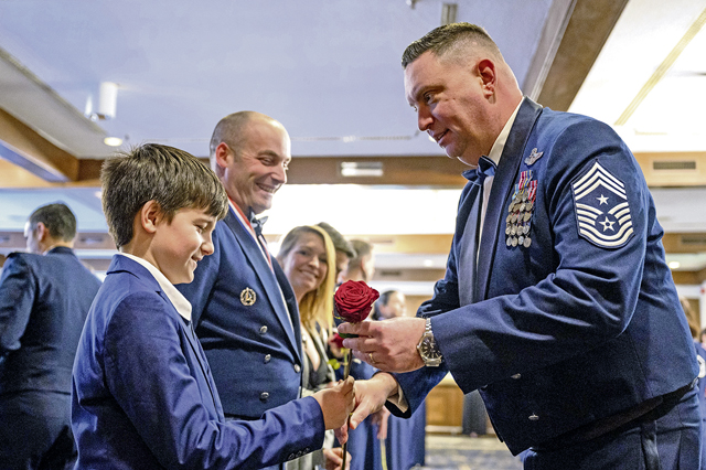 A Team Ramstein member receives a rose from U.S. Air Force Chief Master Sgt. Louis Ludwig, 86th AW command chief, at Ramstein Air Base, Germany, Feb. 7, 2025. The ceremony recognized nominees and award winners for their accomplishments and contributions in 2024. (U.S. Air Force photo by Senior Airman Renan Arredondo)