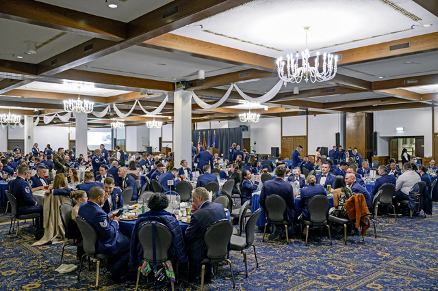 Team Ramstein members attend the 2024 86th Airlift Wing Annual Awards Ceremony at Ramstein Air Base, Germany, Feb. 7, 2025. The annual awards ceremony recognized 12 award winners from the 86th AW as well as all the nominees for their accomplishments and contributions over the past year. (U.S. Air Force photo by Senior Airman Renan Arredondo)