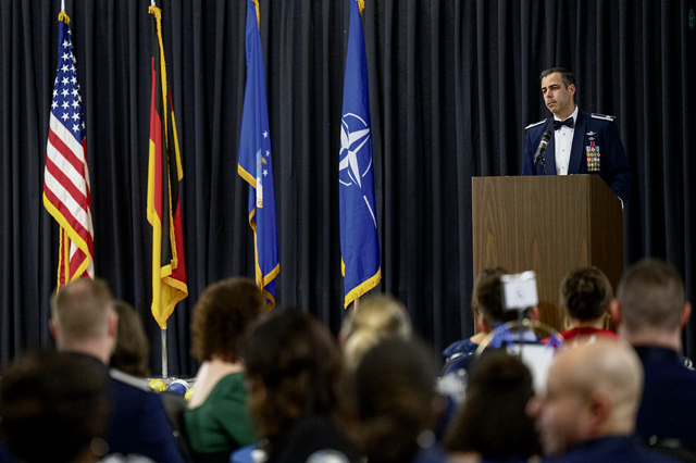 U.S. Air Force Col. Jamil I. Musa, 86th Airlift Wing deputy commander, recognizes the accomplishments of U.S. Airmen and civilians assigned to the 86th AW during an annual awards ceremony at Ramstein Air Base, Germany, Feb. 7, 2025. Annual award nominees were selected based on their work performance and airmanship in 2024. (U.S. Air Force photo by Senior Airman Renan Arredondo)