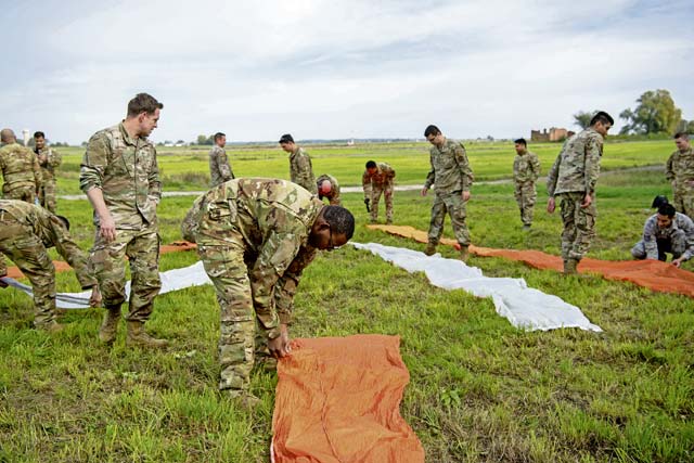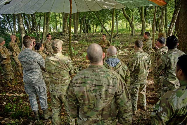 Airmen assigned to the 424th Air Base Squadron participate in a Survive, Evasion, Resistance and Escape course at Supreme Headquarters Allied Powers Europe Airfield-Chièvres Air Base, Belgium, Oct. 12. The course, led by Ramstein Air Base 86th Operations Support Squadron SERE instructors, as part of the 424th ABS 10-year anniversary celebration — allowing members of the 424th ABS to wear mix-matched uniforms and morale patches.