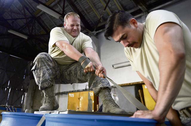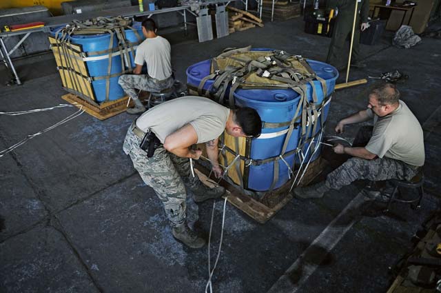 Tech. Sgt. Ryan Price, 86th Logistics Readiness Squadron air delivery supervisor, pulls chords to tighten an airdrop bundle Aug. 29 on Otopeni Air Base, Romania. Aerial delivery Airmen, commonly known as riggers, are responsible for securing bundles and correctly rigging parachutes in order to ensure proper opening of the former.