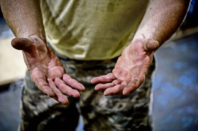 Tech. Sgt. Ryan Price, 86th Logistics Readiness Squadron air delivery supervisor, shows the dirt on his hands after a full day of building airdrop bundles Aug. 29 on Otopeni Air Base, Romania. Aerial delivery Airmen, along with hundreds of other Airmen from Ramstein arrived in Romania to conduct a bilateral training exercise with the Romanian military.