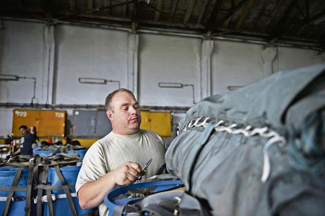 Tech. Sgt. Ryan Price, 86th Logistics Readiness Squadron air delivery supervisor, trims strings on an airdrop bundle Aug. 29 at Otopeni Air Base, Romania. Aerial delivery specialists from Ramstein assisted with airdrops during a bilateral training exercise in Romania.