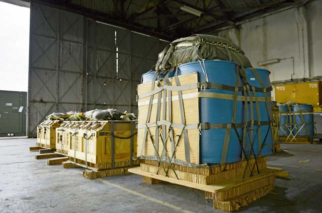 Airdrop bundles constructed by U.S. Airmen await loading during a bilateral training exercise Aug. 29 on Otopeni Air Base, Romania. Aerial delivery Airmen from the 86th Logistics Readiness Squadron at Ramstein arrived in Romania to build bundles for Carpathian Fall 2017.