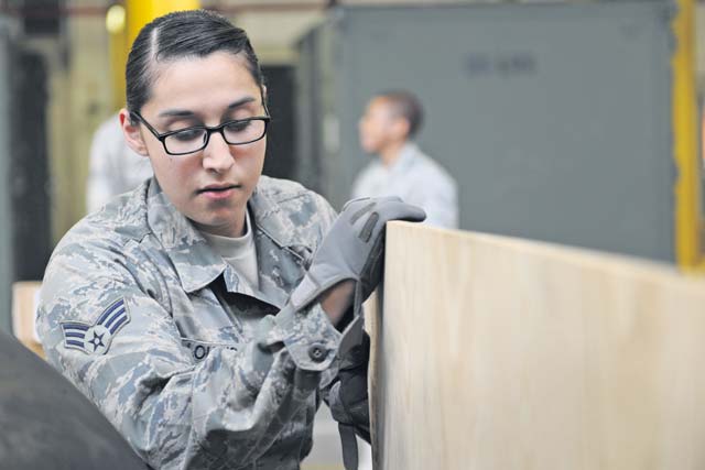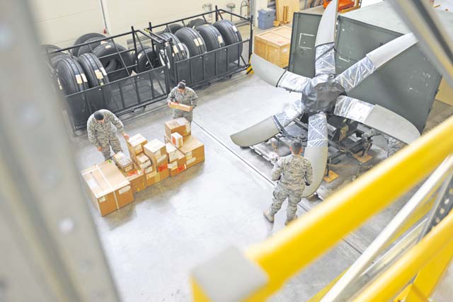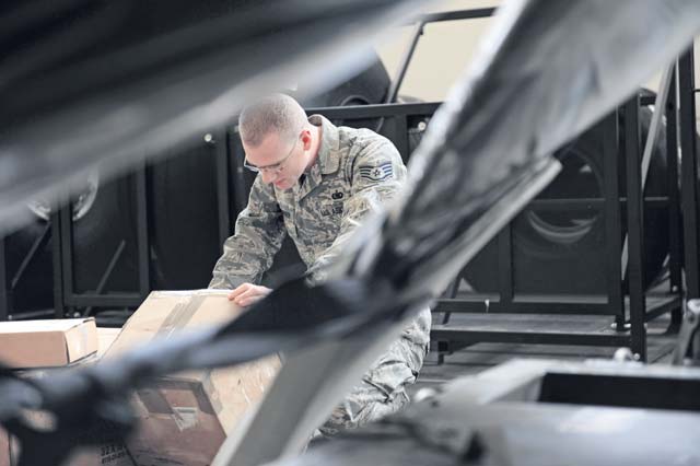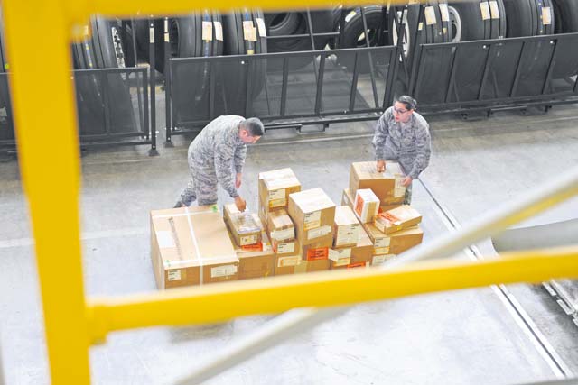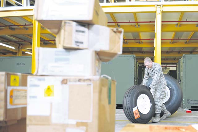 Photos by Michael Stuart Supply journeymen from the 86th Logistics Readiness Squadron sort equipment and prepare for a contingency tasking Sept. 24 on Ramstein. To get ready for a contingency tasking, the 86th LRS pulls aircraft parts from a warehouse, stage it, conduct inventory and then get it ready for missions.