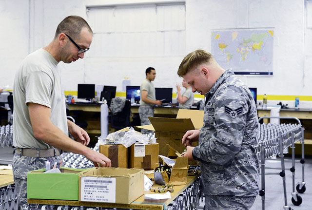 U.S. Air Force Staff Sgt. Jonathan Mayle, a 125th Fighter Wing Logistics Readiness Squadron traffic management journeyman, inventories bolts while working with an 86th LRS Airman, at Ramstein, June 12. The 125th LRS is participating in a training mission and is learning new job techniques to bring back to their home station.