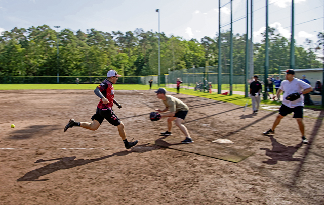 Participants of the 86th Airlift Wing Sports Day play softball at Ramstein Air Base, Aug. 31. Service members and civilians participated in a number of sports and competitions.