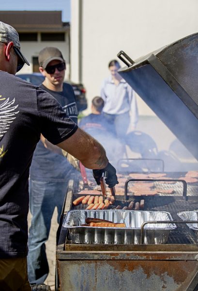 Volunteers at the 86th Airlift Wing Sports Day grill hamburgers and hotdogs at Ramstein Air Base, Aug. 31.