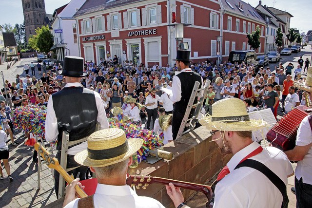 Tapping of the keg will be on Saturday at 6:30 p.m., followed by live music with “Strassenmusikanten” and fireworks at 9:45 p.m. On Sunday rides will pick up at 1 p.m. and line up for the parade at 2 p.m., which will circle around town and end for the “Kerwerede.” Monday starts with “Frühschoppen” and the Straussjugend will sing at the market fountain at 7 p.m. On Tuesday evening at 8 p.m. the Straussjugend will meet for the last time to “bury” the Kerwe.