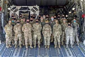 While inside the TIS, Maj. Mark Dellinger, 36th Aeromedical Evacuation Squadron training flight commander, and Senior Master Sgt. Michael Malone, 36th AES training noncommissioned officer in charge and AE technician, both assigned to Keesler Air Force Base, Miss., briefed Hogg and Kolczynski on Dover AFB’s role in safely transporting patients, medical support personnel and aircrew during the COVID-19 pandemic.