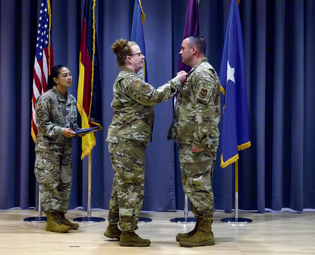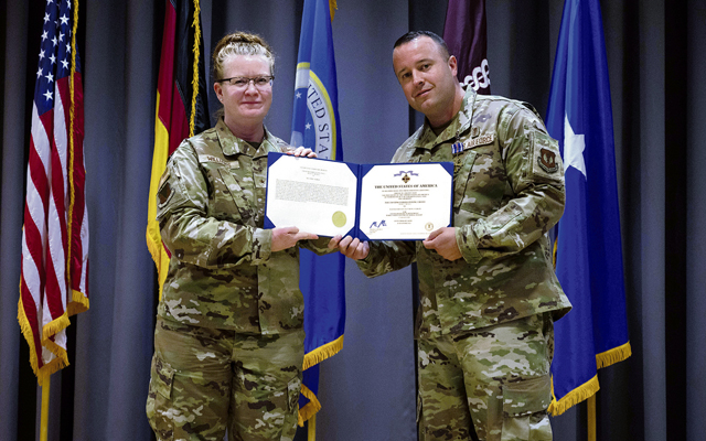 U.S. Air Force Master Sgt. Matthew J. Parker received the Distinguished Flying Cross with a “C” device, denoting a combat award, at Landstuhl Regional Medical Center Sep. 6, from U.S. Air Force Brig. Gen. Adrienne Williams, commander of the 86th Airlift Wing based at Ramstein Air Base.