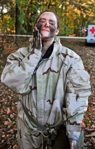 Staff Sgt. Crystal S. Newman, the enlisted strength management NCO for the 21st Theater Sustainment Command personnel office, applies coal dust to her face after going through the gas chamber Oct. 31 at Breitenwald Range.