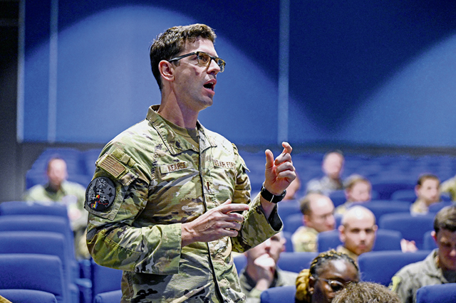 U.S. Air Force Maj. Gen. Duke “Juice” Pirak, Air National Guard deputy director, briefs members at Ramstein Air Base Germany, Dec. 11, 2024. ANG members play a key role in safeguarding the homeland, serving our communities and executing global operations. (U.S. Air Force photo by Airman 1st Class Jason Jones Jr.)