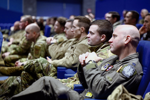 U.S. Air Force Air National Guard members attend an all call given by U.S. Air Force Maj. Gen. Duke “Juice” Pirak, Air National Guard deputy director, at Ramstein Air Base, Germany, Dec. 11, 2024. This all call gave Airmen the chance to interact with Pirak and for him to recognise some outstanding Airmen in attendance. (U.S. Air Force photo by Senior Airman Regan Enriquez)