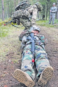 He responds quickly by dropping to the ground and aiming his rifle toward a thicket of oak trees. Twenty yards in front of him, his battle buddy has taken a bullet to the leg and writhes in pain. The medic must make his way to his buddy, dress the wound and drag him to safety.