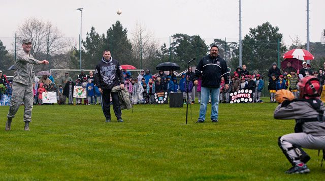 Brig. Gen. Jon T. Thomas, 86th Airlift Wing commander, throws the ceremonial first pitch of the KMC’s baseball season April 23 on Ramstein. The event is a longstanding ritual of American baseball in which a guest of honor throws the first pitch to launch the new season.