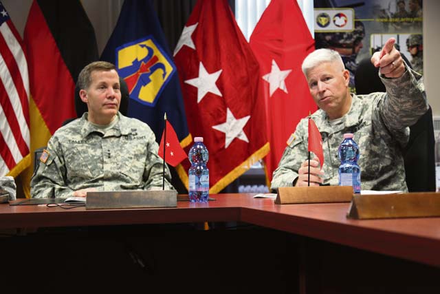 Chief of the Army Reserve Lt. Gen. Jeffrey Talley (left), listens to 7th Civil Support Command Commanding General Brig. Gen. Arlan M. Deblieck during a meeting with the unit’s senior leadership at 7th CSC headquarters June 2.