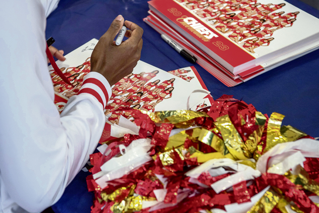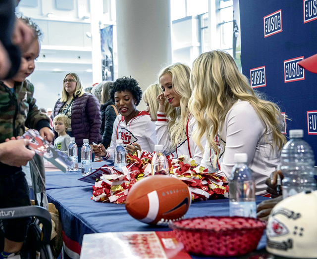 Kansas City Chiefs cheerleaders sign autographs for members of the Kaiserslautern Military Community at Ramstein Air Base, Germany, Nov. 2, 2023. The event was an opportunity for KMC members to get autographs and meet cheerleaders and a former Chiefs’ player before the Chiefs played in Frankfurt, Germany. (U.S. Air Force photo by Airman Trevor Calvert)