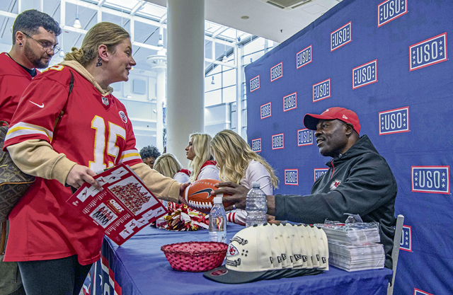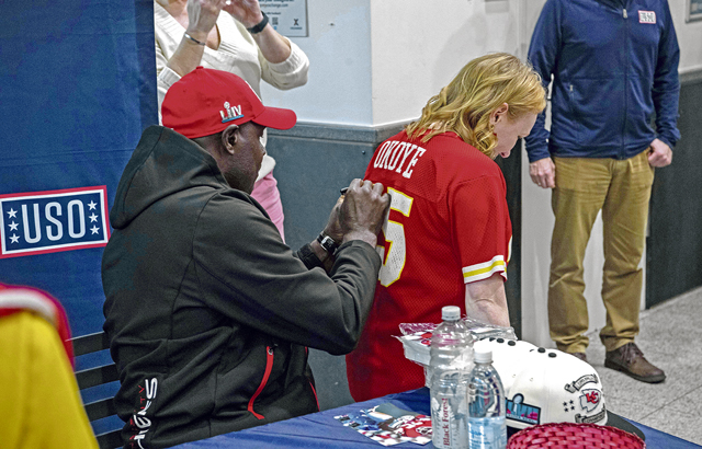 Christian Okoye, former Kansas City Chiefs running back, signs a Chiefs fan’s jersey at Ramstein Air Base, Germany, Nov. 2, 2023. The Chiefs held a raffle for active duty military members to win two tickets to their game against the Miami Dolphins held in Frankfurt, Germany. (U.S. Air Force photo by Airman Trevor Calvert)
