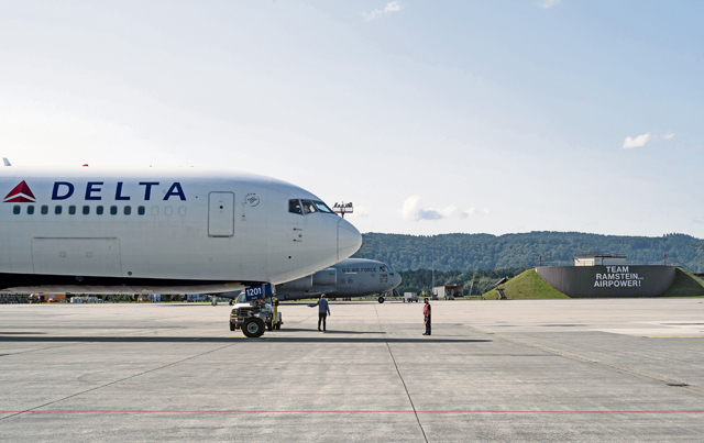A Delta A350 767 commercial aircraft rests during Operation Allies Refuge at Ramstein Air Base, Aug. 24. This is the first time Delta Airlines is transporting evacuees from Ramstein to more permanent resettlement locations as part of the Civil Reserve Air Fleet for Operation Allies Refuge. Team Ramstein is providing safe, temporary lodging for evacuees from Afghanistan. Operation Allies Refuge is facilitating the quick, safe evacuation of U.S. citizens, Special Immigrant Visa applicants and other at-risk Afghans from Afghanistan. Evacuees receive support, such as temporary lodging, food and water and access to medical care as well as religious care at Ramstein Air Base while preparing for onward movements to their final locations. (U.S. Air Force photo by Senior Airman Milton Hamilton)