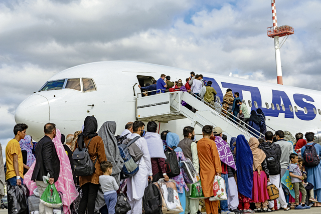 Evacuees board an Atlas Air aircraft for a departure flight from Ramstein Air Base on their way to the United States as part of Operations Allies Refuge, Aug. 24. Ramstein, a transit location for evacuees from Afghanistan, provided temporary lodging, food, medical services and treatment while they awaited transportation to the United States. Nearly 48 hours after the operation began, more than 7,000 evacuees have landed at Ramstein. (U.S. Air Force photo by Airman Edgar Grimaldo)