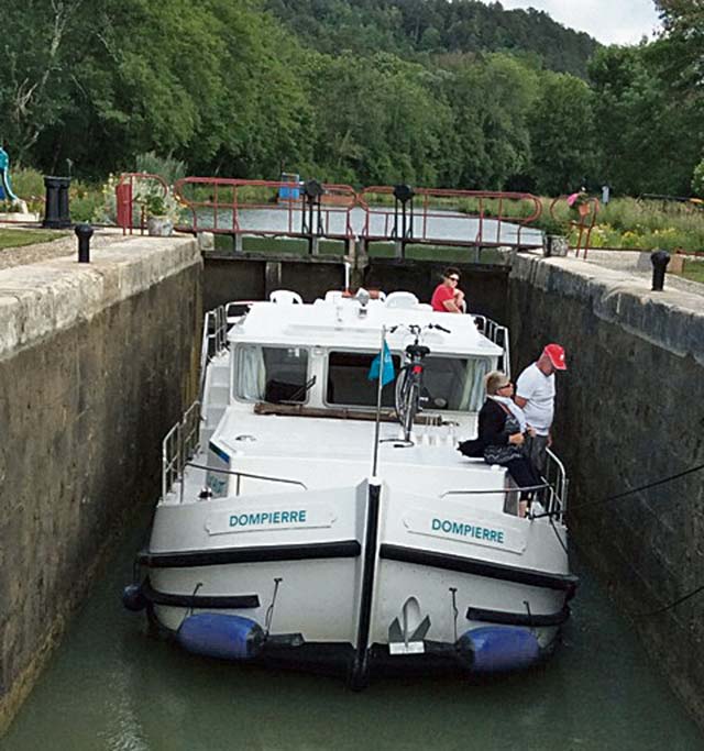 The Burgundy canal system was started in the late 1700s and completed in 1832. The locks still retain their old world character and charm. Lock gates are opened and closed with hand cranks, so water trapped inside quickly rises or drops to the needed level. In this part of Burgundy, locks are managed by lock-keepers, available from 9 a.m. until noon and 1 to 7 p.m. Most lock-keepers manage two or three locks and shuttle back and forth by bicycle, moped or car. These locks offer great photo opportunities of delightful, helter-skelter gardens and flower boxes brimming with colors and blossoms. At Lock No. 82, there was a hand-crafted wooden rack of homemade marmalades, coffee and pastries to go. Lock No. 87 offered bottles of Burgundy wine and glasses of sangria and delightful garden art created by a lock-keeper with a lively, whimsical imagination. Friendly dogs and curious cats greeted us at most stops, and families of ducks often paddled alongside.