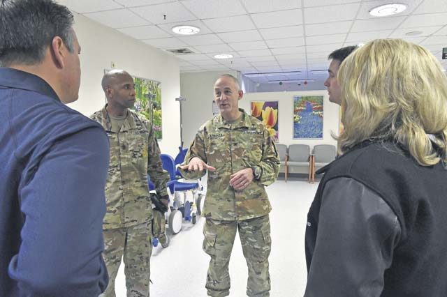 U.S. Army Col. James Laterza, Landstuhl Regional Medical Center commander, briefs the governors of Wisconsin, Oklahoma and Nevada Dec. 9 at LRMC. The governors received a tour of the hospital after spending time with their constituents in the U.S. Air Forces Central Command area of responsibility.