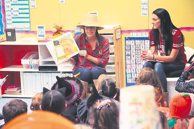 Katherine Sadusky (left) and Kylie Nelson, both second-grade teachers, read books to students during a Fall Harvest Moon Reading night Oct. 27 at Vogelweh Elementary School. Students dressed in costumes, enjoyed a hot dog dinner and listened to books read to them by teacher volunteers. All students received a free book courtesy of VES PTSA.