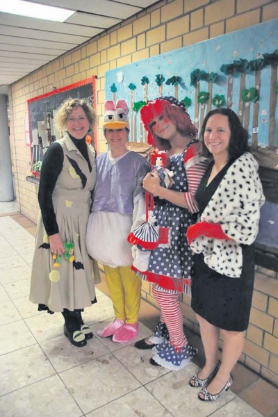 (From left) Kelly Scott, first-grade teacher, Kerri Larimer, information specialist, Kristine Cephus, kindergarten teacher, and Amy Hudzikiewicz, first-grade teacher, pose for a photo during a Fall Harvest Moon Reading night at Vogelweh Elementary School.