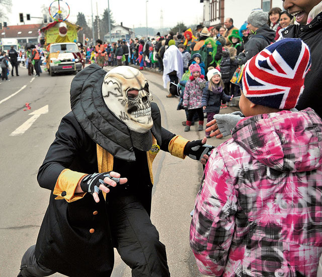An individual in costume scares the spectators along the route of last year’s Fasching parade in Ramstein-Miesenbach. This year’s parade starts at 2 p.m. Tuesday.