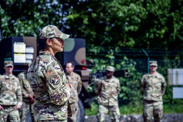 U.S. Air Force Lt. Col. Stacie Coleman, 7th Combat Weather Squadron commander, thanks Airmen from the 7th CWS and Soldiers from the U.S. Army 66th Military Intelligence Brigade after a joint training exercise at U.S. Army Garrison Wiesbaden, Aug. 4. The Airmen and Soldiers partnered to train on Army warrior skills like land vehicle and convoy operations, environmental survival skills and tactical communications training. The 7th CWS attaches to Army special operations teams to provide accurate weather intelligence needed to execute missions in the air and on the ground. This training helped familiarize the Airmen with warrior skills to increase their capabilities downrange.