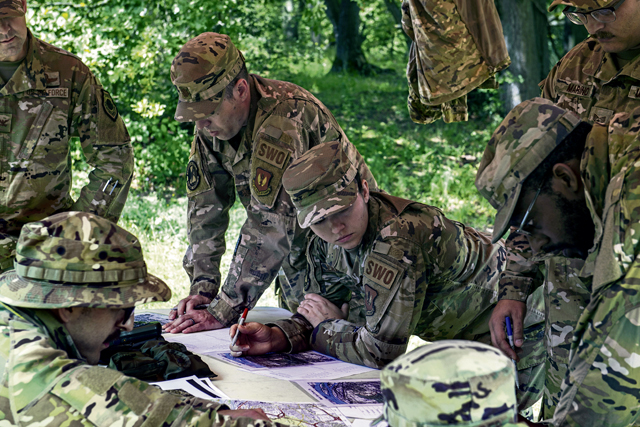 U.S. Air Force Tech. Sgt. Katelyn Lawrence, a 7th Combat Weather Squadron weather craftsman, completes land navigation training at U.S. Army Garrison Wiesbaden, Aug. 4. The 435th AGOW builds expeditionary airfields on demand, provides joint airpower integration, enables multi-theater sustainment and support, delivers premier specialty training and builds partner capacity. (U.S. Air Force photo by Capt. Shelby Chapman)