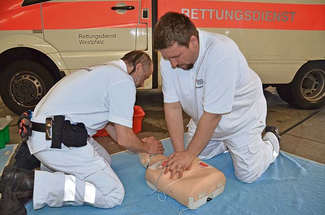German Red Cross, conduct CPR training during the garrison’s annual summer safety day May 7 on Rhine Ordnance Barracks in Kaisers-lautern.