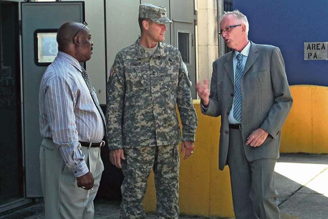 Maj. Gen. John R. O’Connor, center, the commanding general of the 21st Theater Sustainment Command receives a guided tour of Theater Logistics Support Center Europe by Helmut Haufe, right, the general manager of TLSC-E and Randy Griffin, left, an accountable officer with the TLSC-E, July 22. Haufe and Griffin gave O’Connor a brief about 21st TSC mail operations, maintenance operations and supply support activity operations.