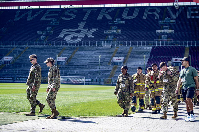 Airmen from Ramstein Air Base participated in a stair climb ruck march in honor of the firefighters and paramedics who lost their lives during the terrorist attacks on Sep. 11, 2001, at Fritz-Walter Stadium in Kaiserslautern, Sep. 11. The event attracted approximately 60 attendees including U.S. Army Soldiers and firefighters from Kaiserslautern, Germany’s fire protection service. In total, 343 first responders died in New York City while working to rescue victims trapped in the World Trade Center following the attacks.