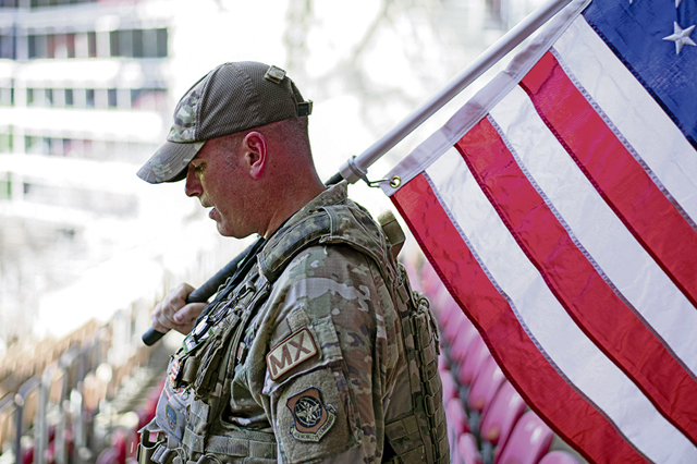 U.S. Air Force Senior Master Sgt. Trevor Derr, 721st Aircraft Maintenance Squadron lead production superintendent, carries an American flag during a memorial ruck march Sep. 11, in honor of the first responders who lost their lives during the terrorist attacks on Sep. 11, 2001. Derr, one of the event’s organizers, joined both Soldiers from U.S. Army Garrison Rheinland-Pfalz and firefighters from Kaiserslautern, Germany’s fire protection service, in attending the ruck march.